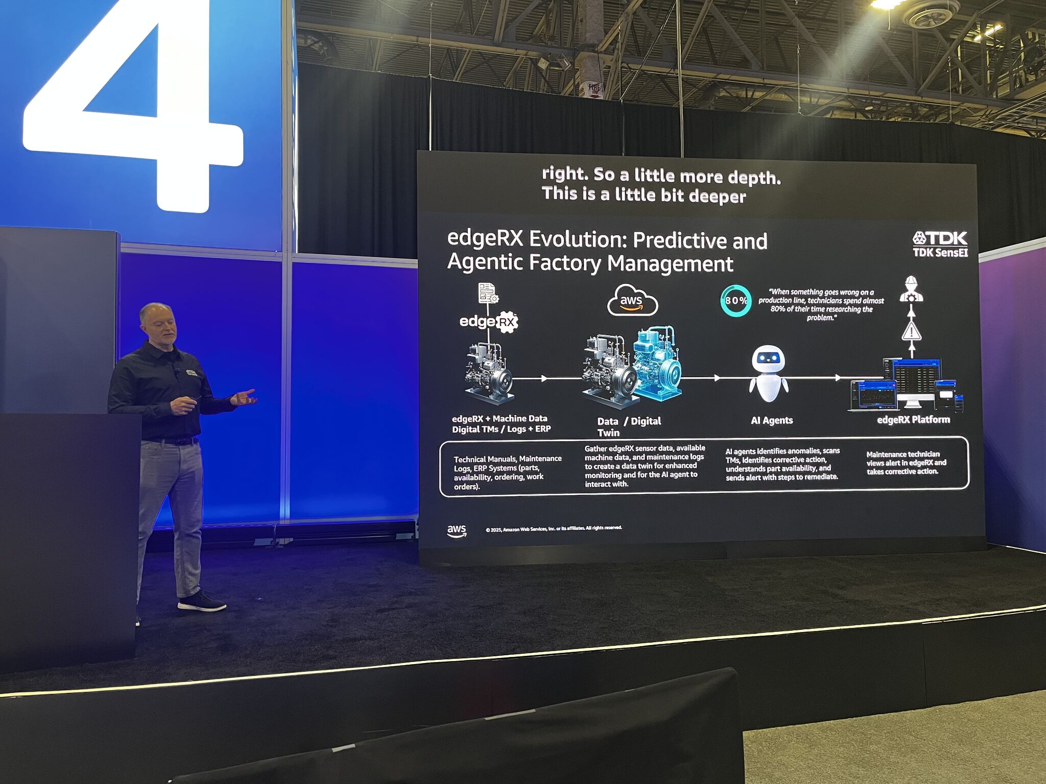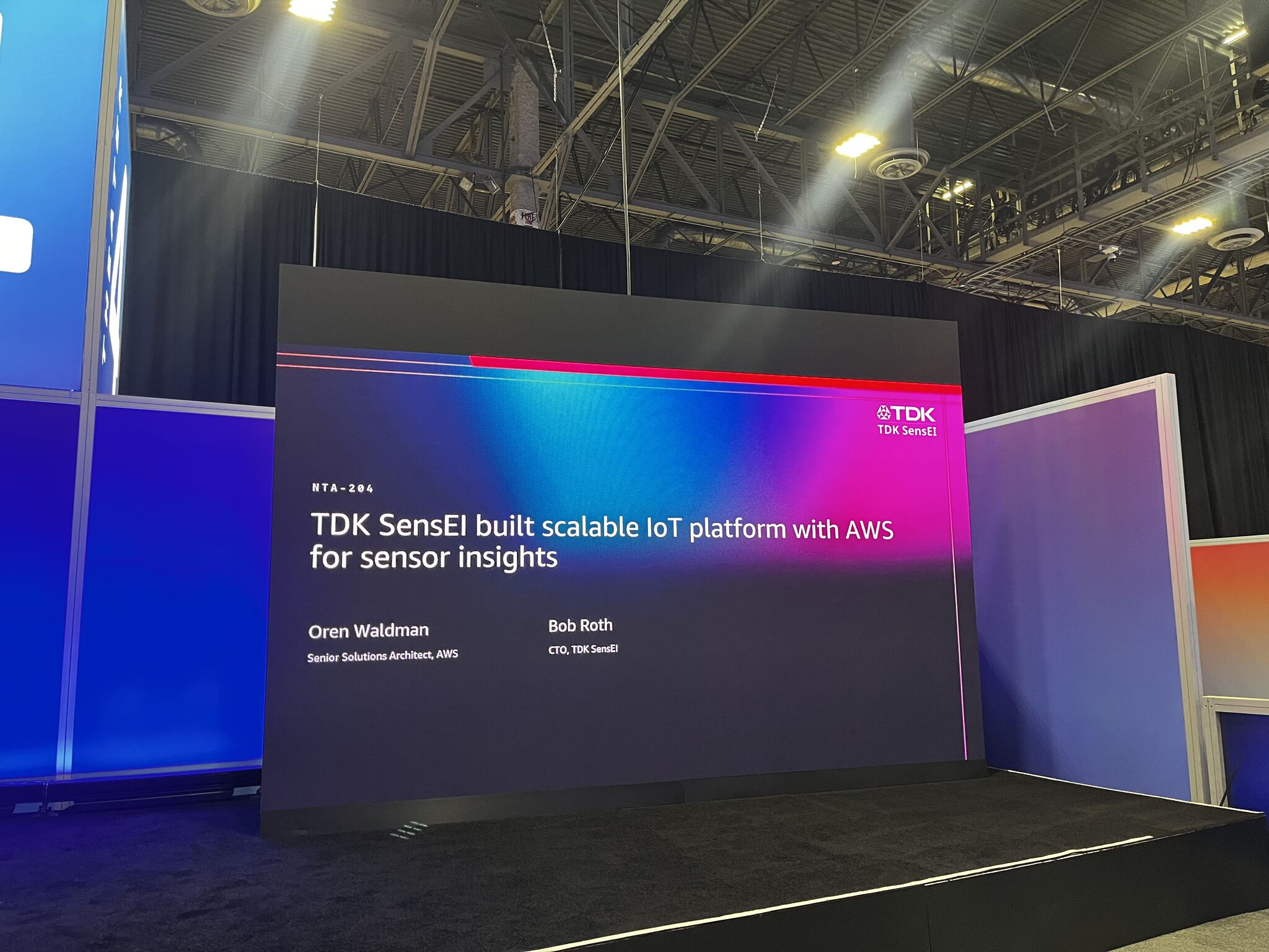 大会最后一日,TDK SensEI 首席技术官鲍勃・罗斯发表 **《TDK SensEI 携手亚马逊云科技打造可扩展物联网平台,释放传感器数据价值》** 主题演讲,分享 TDK SensEI 如何依托亚马逊云科技的各类项目与服务,设计并打造可规模化拓展的工业物联网与人工智能平台。演讲中详细解读了解决方案的架构设计思路、与亚马逊云科技的合作模式及项目落地的最佳实践。该演讲视频可点击此处观看,也可在我司官网视频专区查看。